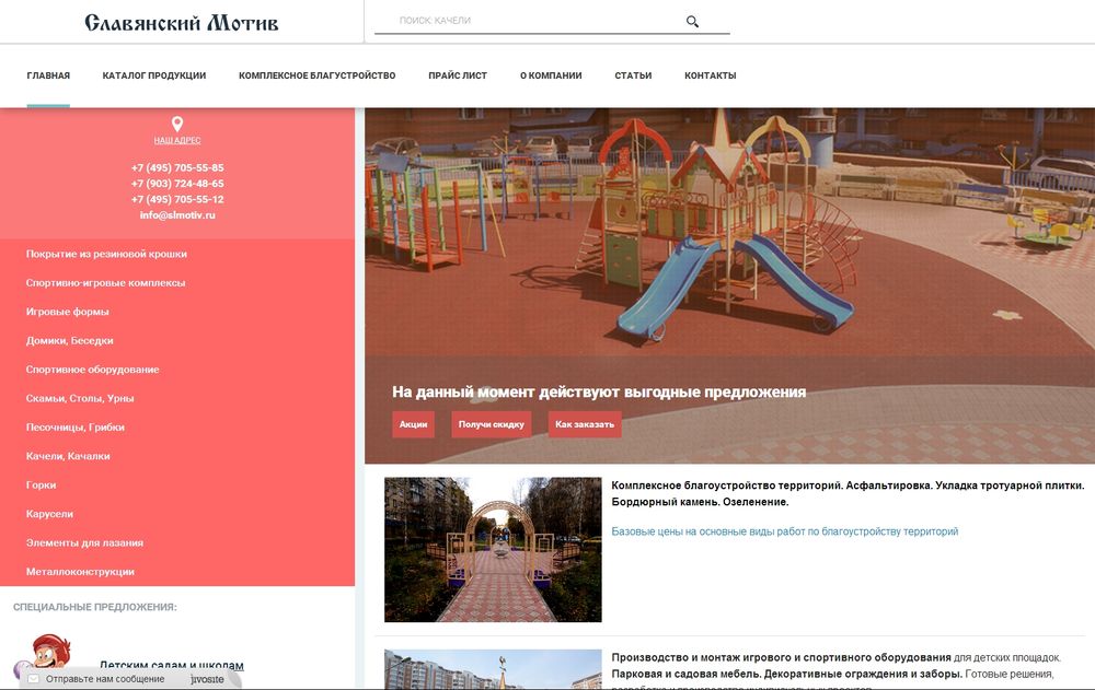 Ландшафты, озеленение, благоустройствоСлавянский МотивРоссия - МоскваФирма «Славянский Мотив» работает в области проектирования, изготовления и установки оборудования для благоустройства городских территорий, игрового и спортивного оборудования (качели, горки детские, песочницы, качалки, игровые комплексы, хоккейные коробки, шведские стенки, теннисные толы и т.п.), детских спортивно-игровых комплексов, а также устройство проездов, пешеходных дорожек и озеленение территорий с 1998 года. Изделия фирмы рекомендованы Художественным советом Москомархитектуры и внесены в Каталог малых архитектурных форм города Москвы.