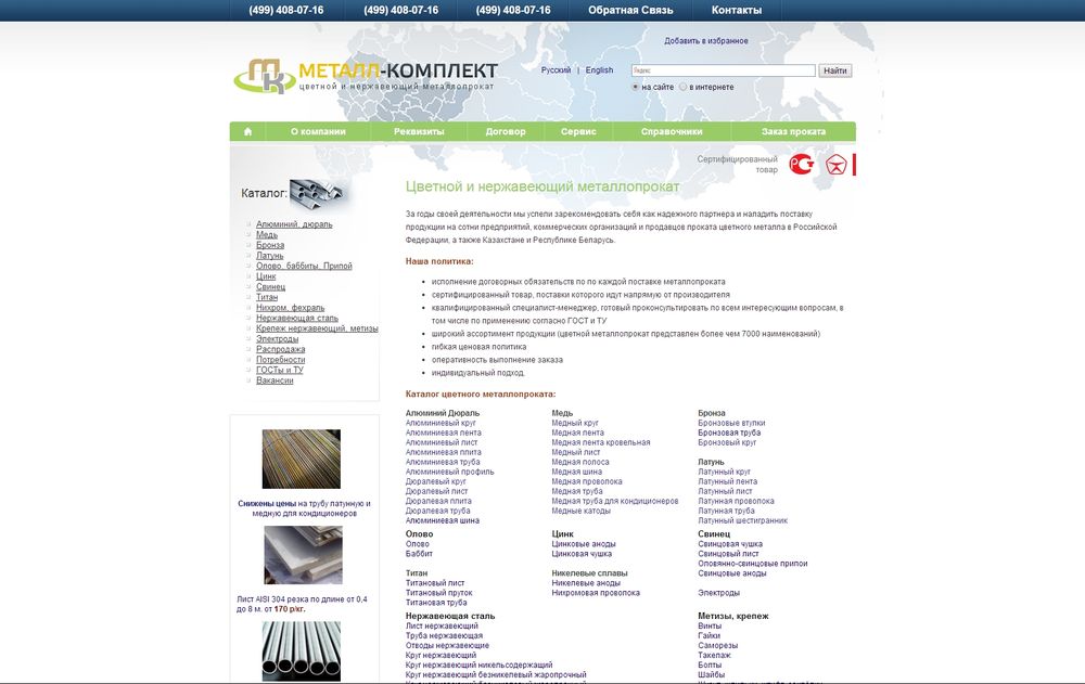 Металлоконструкции, металлоизделияМеталл-комплект реализация цветного металлопроката и нержавеРоссия - КраснодарМеталл-комплект реализация цветного металлопроката и нержавеющей стали алюминий и сплавы на его основе, медь и медно-никелевые сплавы, бронза, латунь, титан, магний и сплавы, никель, нихром, фехраль, олово, баббиты, свинец, цинк и сплавы, ферросплавы и нержавеющей стали лист лента фольга плита проволока пруток круг трубы уголок кровельная медь метизы