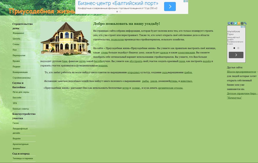 Другие сайтыПриусадебная жизньРоссия - Санкт ПетербургНа страницах сайта собрана информация, которая будет полезна всем тем, кто только планирует строить дом, кто уже строит или перестраивает. Также те, кто хочет открыть своё собственное дело в области строительства, технологии производства стройматериалов, сельского хозяйства.
