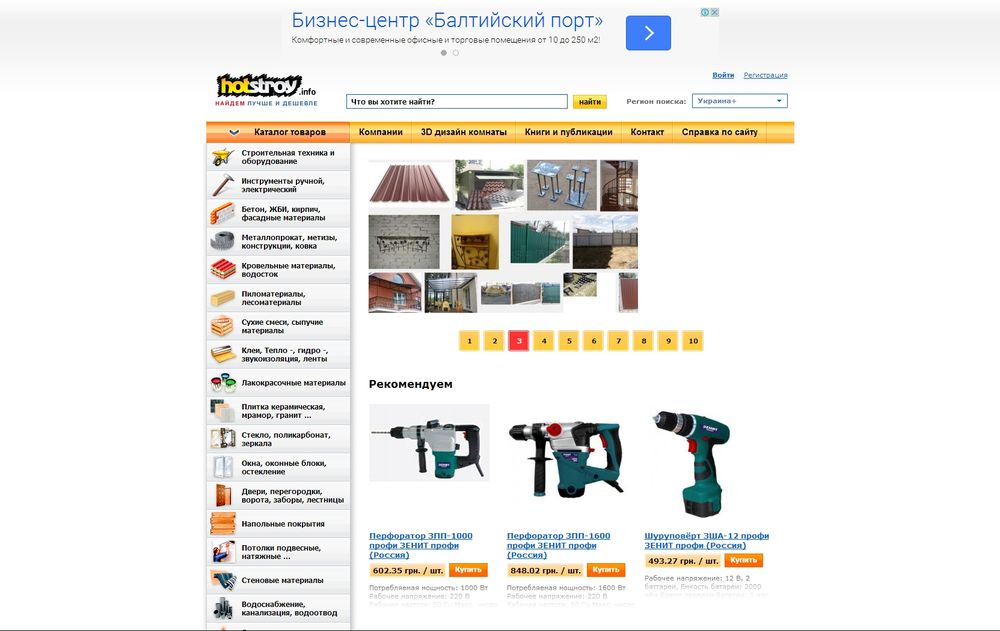 Его разделы - "Строительная техника и оборудование", "Инструменты ручной, электрический", "Бетон, ЖБИ, кирпич, фасадные материалы", "Сухие смеси, сыпучие материалы", "Кровельные материалы, водосток", "Металлопрокат, метизы, конструкции, ковка", "Сантехника, керамика, смесители", "Плитка керамическая, мрамор, гранит", "Лакокрасочные материалы", "Тепло-, гидро-, звукоизоляция, клеи, ленты", "Потолки подвесные, натяжные", "Напольные покрытия", "Стеновые материалы", "Окна, оконные блоки, остекление", "Двери, перегородки, ворота, заборы, лестницы", "Пиломатериалы, лесоматериалы", "Отопление и газоснабжение"...