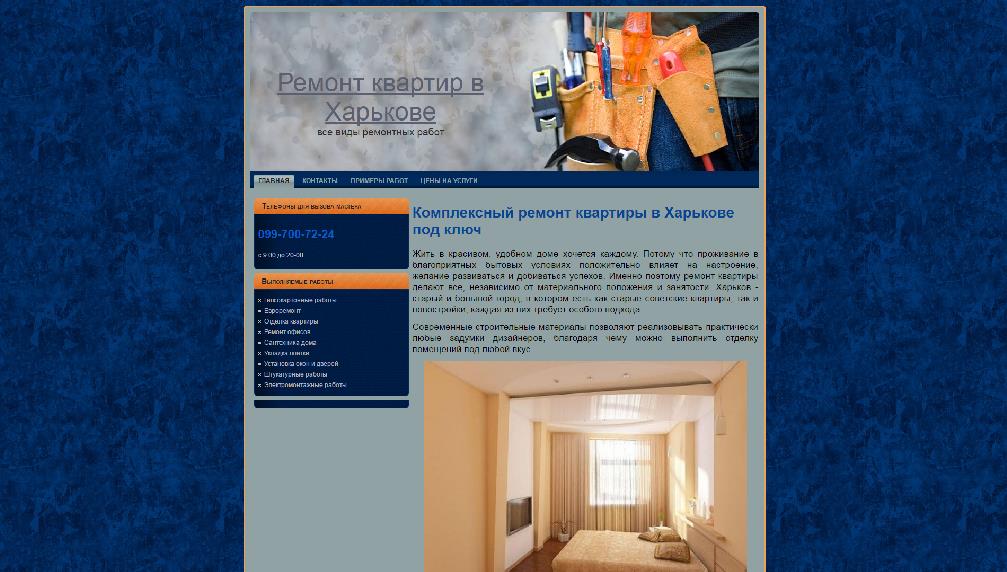 Ремонтные работыРемонт квартирУкраина - ХарьковВыполним следующие виды строительных работ в Харькове: отделка помещений, установка сантехники, электрические работы, электромонтаж, оклейка обоев, укладка паркета