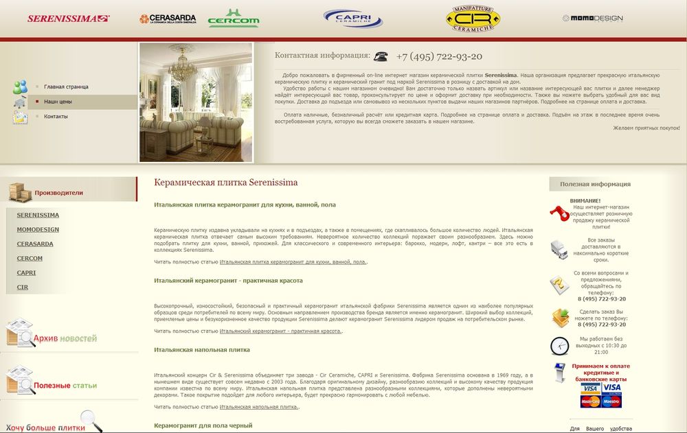 Плитка, мрамор, гранит, каменьСерениссима – керамическая плитка ИталииРоссия - МоскваКерамическая плитка известного производителя Италии: Serenissima. Широкая гамма коллекций плитки позволяет создавать неповторимые интерьеры, а наличие декоров и спецэлементов еще больше расширяют границы фантазии.