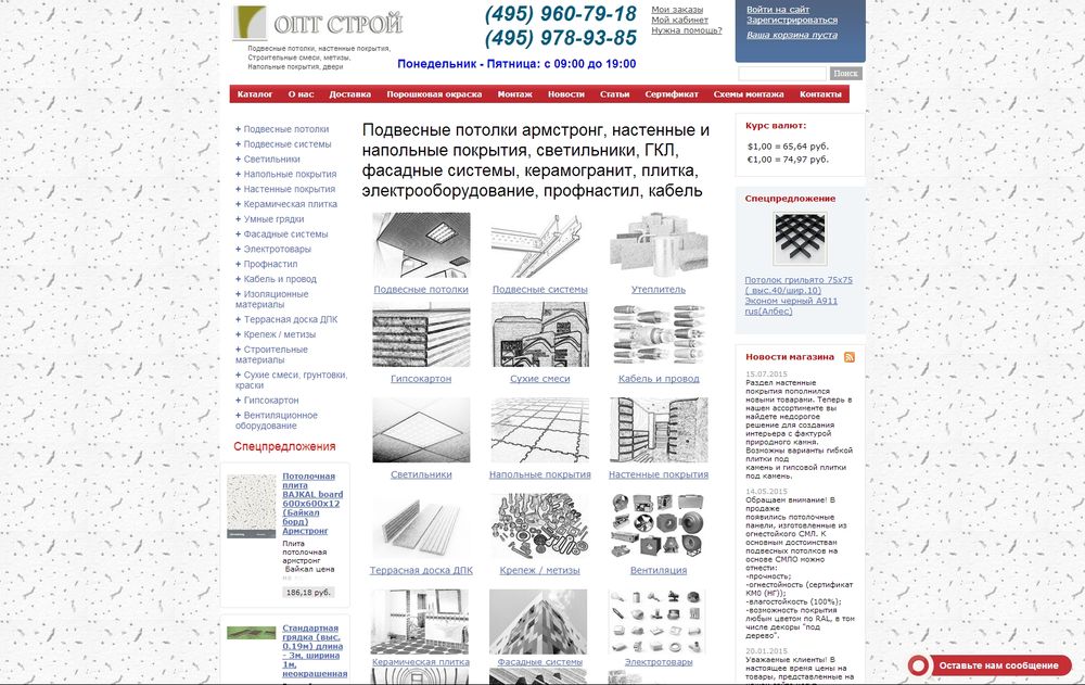 Потолки, стены, обоиПодвесные потолки (армстронг, реечные, кассетные, грильято) Россия - МоскваОрганизация реализует со склада в Москве, оптом и в розницу отделочные материалы для внутренней и фасадной отделки: подвесные потолки типа армстронг, реечные и кассетные из металла, ячеистый грильято; а также МДФ и ПВХ стеновые панели, обои, керамогранит, ламинат, линолеум, гипсокартон, сухие смеси, утеплитель, светильники и вентилируемые фасады и др. Оперативно отправляем грузы в регионы.